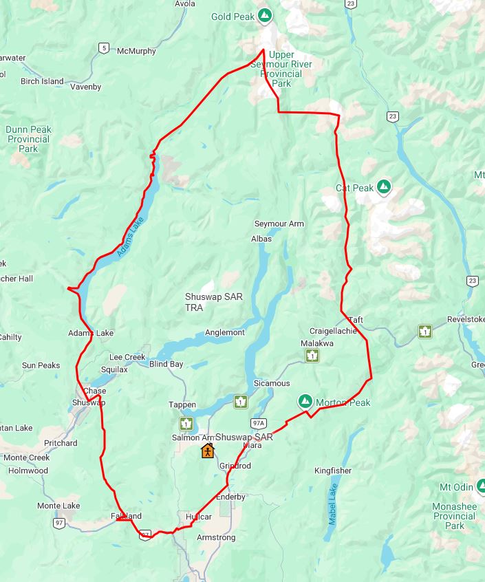 We have one of the largest operational areas in BC, stretching from Chase in the West to Three Valley Gap in the East, and South from Falkland and Enderby to the headwaters of the Seymour River in the North. We also respond to mutual aid calls from our fellow SAR teams throughout the province.